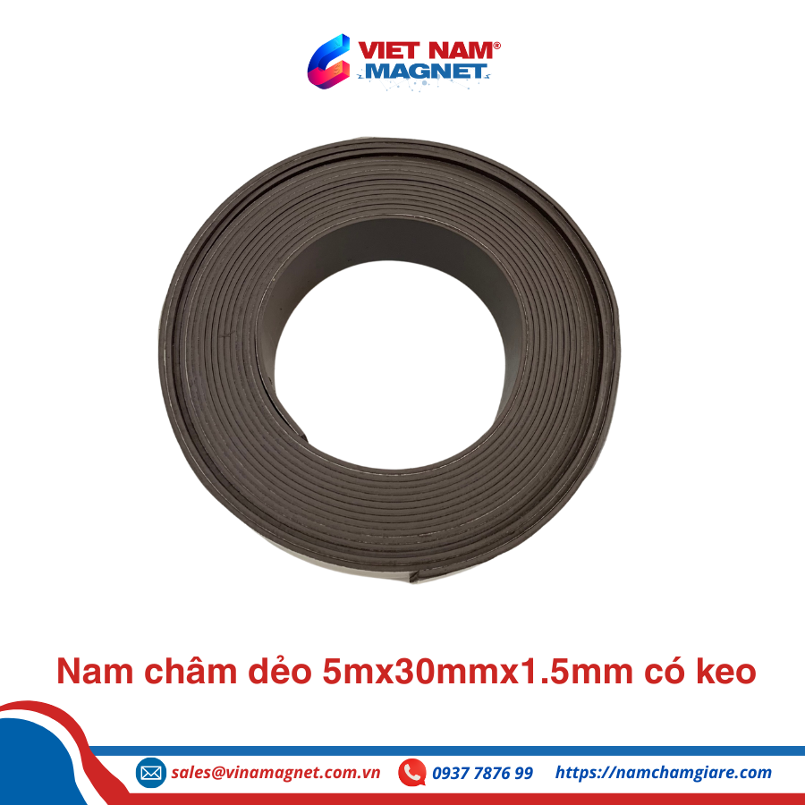 Kích thước tiện lợi: Dài 5m, rộng 30mm, dày 1.5mm – phù hợp nhiều mục đích dán dải từ tính.